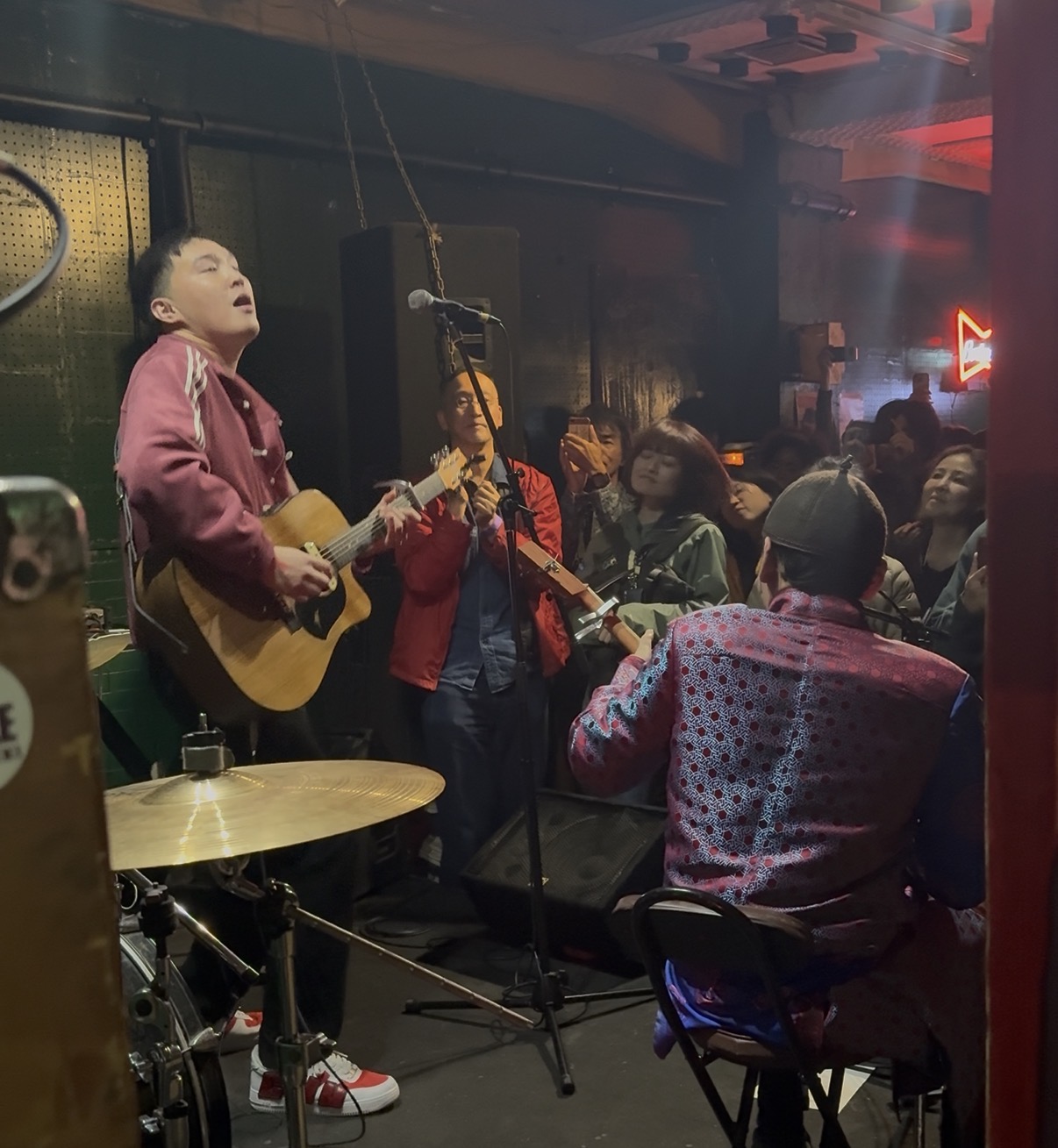 さて、どうしよう。フェス最終日まで商店街のフェスエリアを歩き回った足は、そろそろ限界に近づいています。一番遠い会場であるSLUM BARへ向かう足が少しすくんでしまいます。カフェに入って少し休もうかと迷いながらも、その気持ちを振り切って向かった先は、ロシア連邦・トゥバ共和国出身の2人組ODUCHUのステージでした。